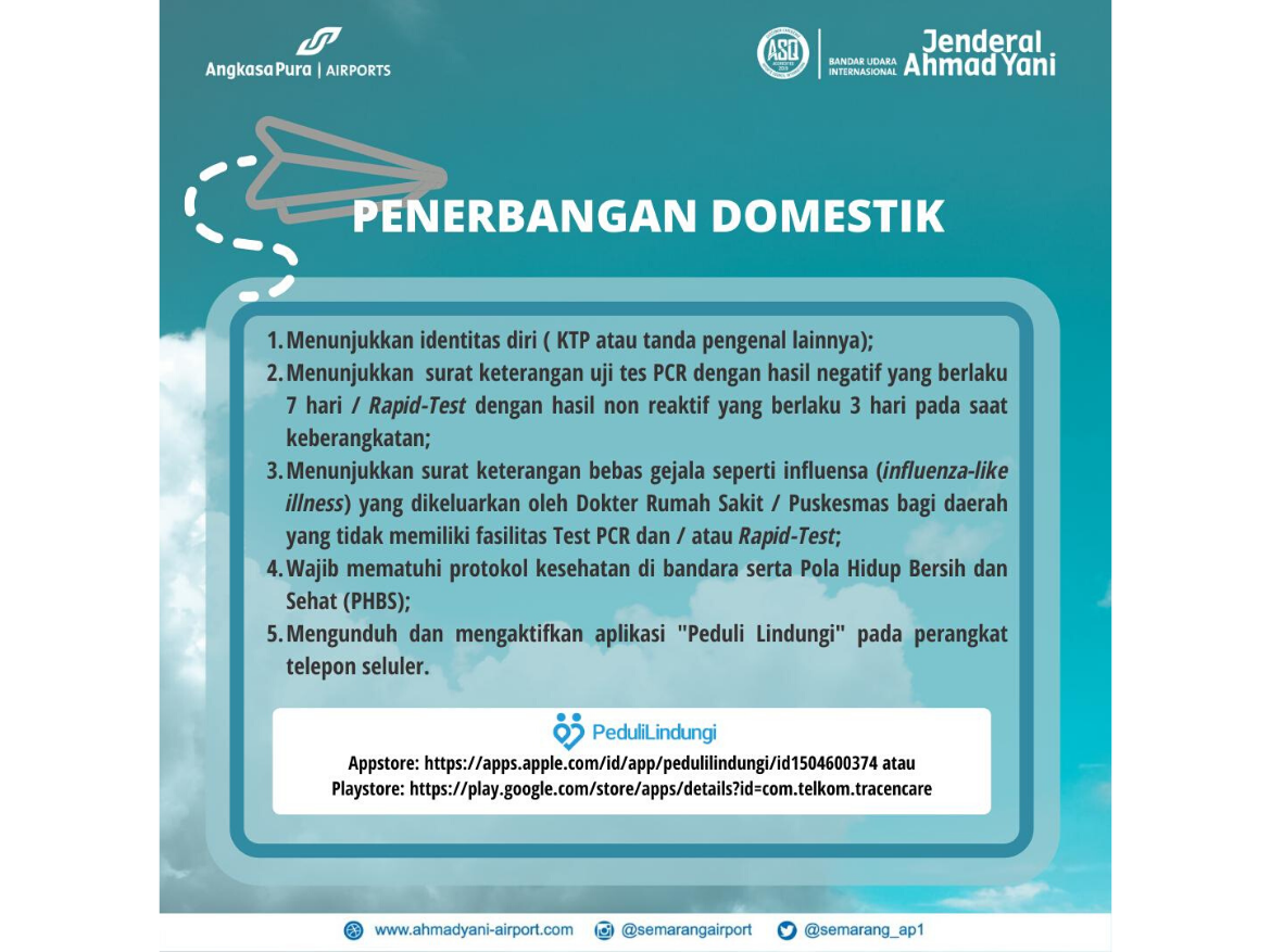 2.    Bagi penumpang penerbangan dalam negeri wajib menunjukkan surat keterangan uji tes PCR dengan hasil negatif yang berlaku 7 hari / Rapid-Test dengan hasil non reaktif yang berlaku 3 hari pada saat keberangkatan. Namun bagi daerah yang tidak memiliki fasilitas Test PCR dan / atau Rapid-Test wajib menunjukkan surat keterangan bebas gejala seperti influensa (influenza-like illness) yang dikeluarkan oleh Dokter Rumah Sakit / Puskesmas;